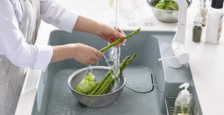 人工大理石アクリストンならではの質感のよさと、流レールの採用により、 調理中の野菜洗いや後片付けの皿洗いの水で シンクの中のゴミをどんどん排水口に向けて流してくれます。