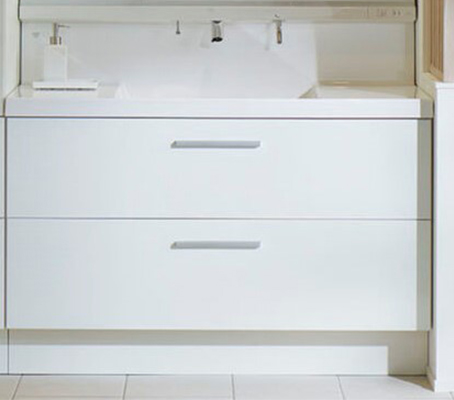 汚れにくいシャワー付きの水栓・底までお掃除できる排水口・ワンサイズ広い洗面器など、使いやすさと、お掃除のしやすさを兼ね備えた洗面化粧台。