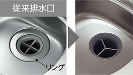 ゴミを溜めやすい溝が生まれる排水溝リングを無くすことで、お手入れの手間を軽減します。