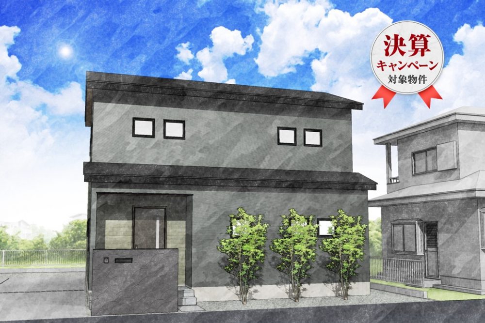 黒のシンプルなサイディングと、柔らかい質感の無垢材が、モダンでおしゃれな雰囲気を演出。横長に統一された窓もポイントです。南側のガレージスペースは玄関につながっており、雨の日の車の乗り降りも快適に。