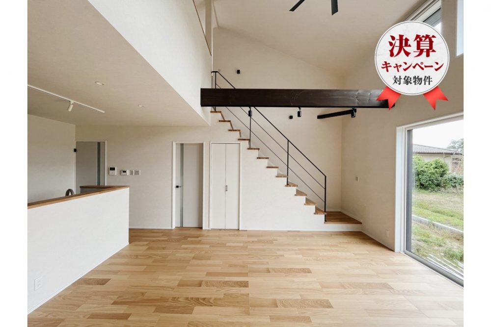リビングの吹き抜けから差し込む柔らかな光と木のぬくもりが、